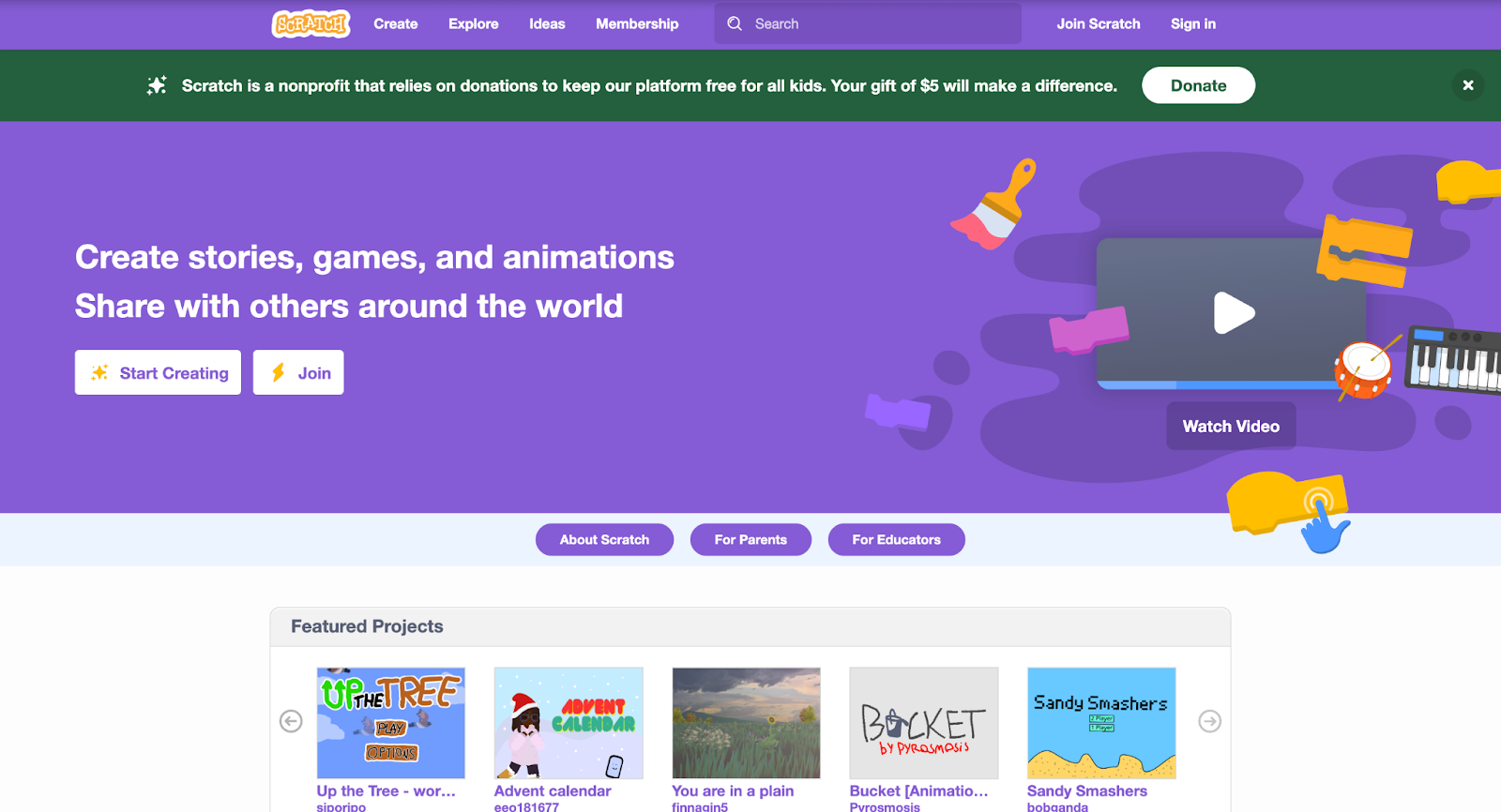 Scratch enables kids to code stories, games, and animations in a visual language, fostering creativity and collaboration in a global community. Developed by a nonprofit, it's free and multilingual. Strengths: promotes problem-solving and equity in computing. Weaknesses: visual-only interface limits advanced coding. HQ not specified, but MIT-based.