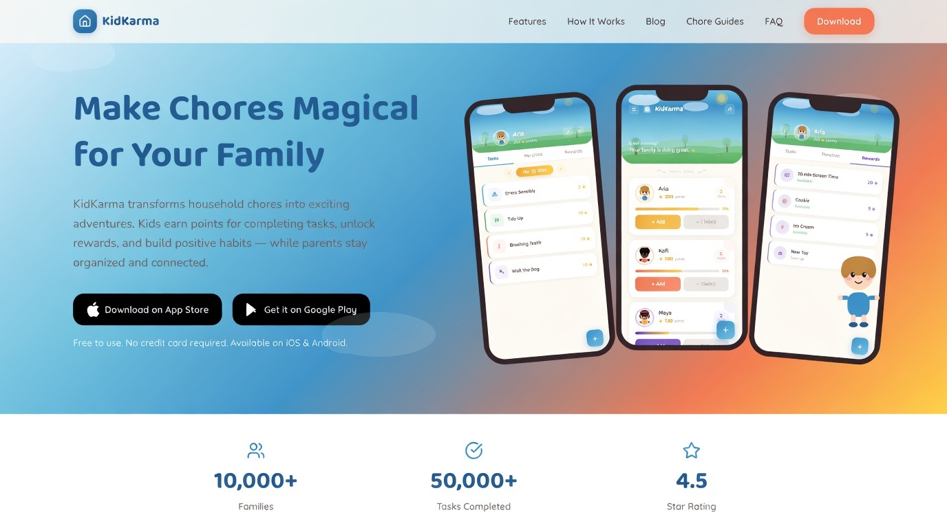 Key features include customizable task lists that match family needs, pet care rewards that make responsibility rewarding, and progress tracking that shows growth over time.